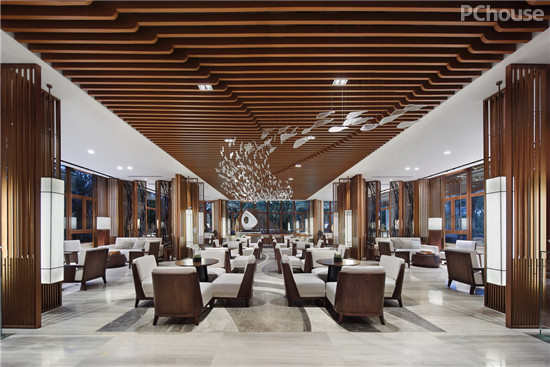设计师在考虑本案过程中,对文昌本地建筑的特征予以了充分的关注,并将之作为本案室内部分的空间色调基础和贯穿线索在设计过程中加以运用。设计师以木材质形成视觉上的梁架跟回建筑的结构,将之视为建筑部分往室内的延伸,而以轻质的编织体有序的贯穿其中,在意象上已经完全跟从了在地建筑的表象特征。只是通过现代的技术和表现手法赋予空间以现代的气息,使空间在不脱离在地文化的同时,与现代人既期盼在地特色又追求精致和舒适的心理平衡。