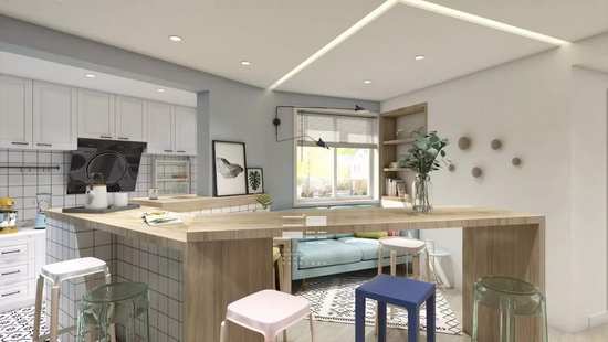 四、折叠式转角吧台,可容纳13人,满足屋主的轰趴梦、桌游梦。不需要时可随时推回去,实用且完全不占地方。