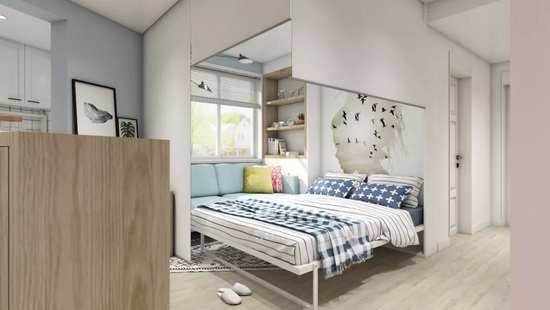 二、隐形的折叠床+电动卷帘 打造一个相对独立的休息空间。床头的画是由Alan手绘上去的,这个画增加了空间的灵动性,让这个空间更加生动。