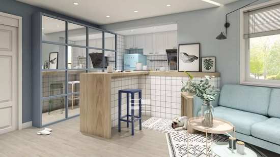 三、利用镜柜储物,可用来放置书籍、鞋或者一些摆饰品,同时可把厨房的采光引到整个客厅。在视觉上也有一定的延展效果,使之看起来更加开阔,敞亮。
