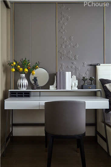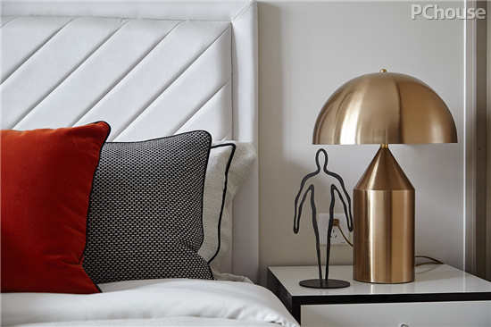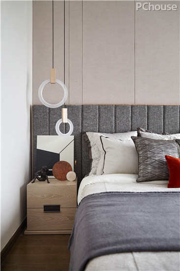 设计师以白色作为卧室的基本色调,延续主人房的风格,搭配以灰色和朦胧橙的床品,和谐辉映,轻与重之间没有繁复也没有冲突,整个空间给人以舒适自然的感觉。