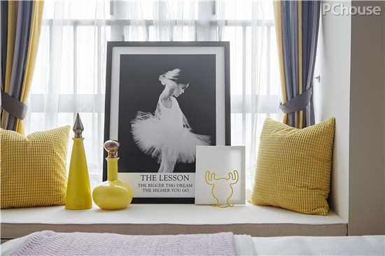 儿童房的空间中,白色是主要的基调,姜黄色的床品在室内作点缀。孩子的世界总是丰富多彩的,随处可见的儿童摆件,和一幅穿芭蕾裙的女孩的照片,呈现出童真和极富艺术气质的空间。