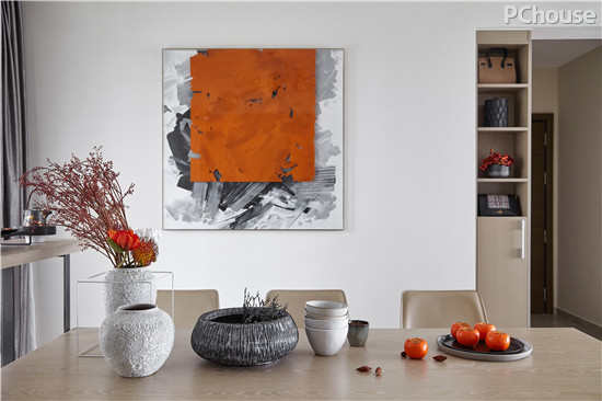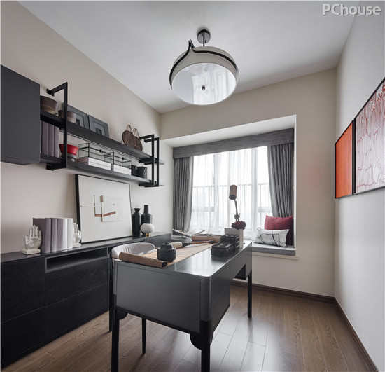 书房以黑色为主色调,沉稳内敛,橙色的挂画在空间中起到了点缀的作用,细微处更见品质,充满着一股潇洒风雅的书卷气,一幅“室雅何须大,花香不在多”的闲适生活情境映入眼前。