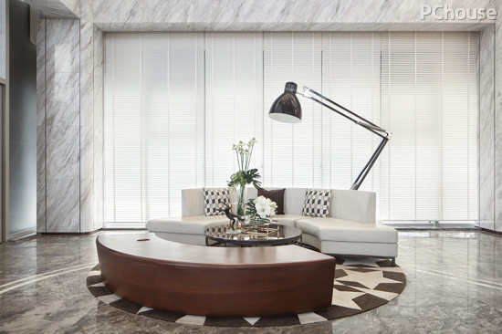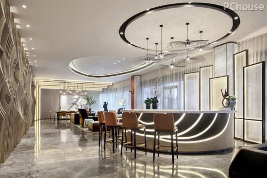 在入口的设计当中,设计师运用大量的圆弧造型,颇有中国山水的灵动之美,以婉约柔美的线条融合石材的冷冽之气,桌椅的高低错落之前,高贵雅致之间却跳脱出寂静感,演绎出一幅活色生香的画面。