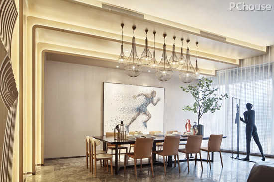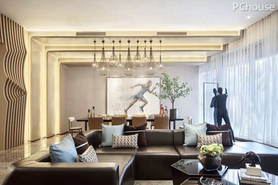 一楼大厅大面积落地窗将室外美景一览无余引入室内,红色运动人物雕塑将视线聚焦于此,极具动感与视觉张力,大型弧形线状吊灯从上而下飘洒而至,打破空间原本沉闷的布局,为空间带来更多生气。