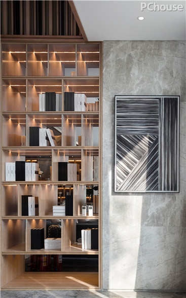 楼梯间从台阶到栏杆扶手的细部处理一丝不苟,台面下方灯带增加纵深感,石材与拉丝不锈钢镀黑钛对比鲜明,楼梯扶手的线条感与石材毛凿面肌理交融构成其建筑形态,充满力量感。