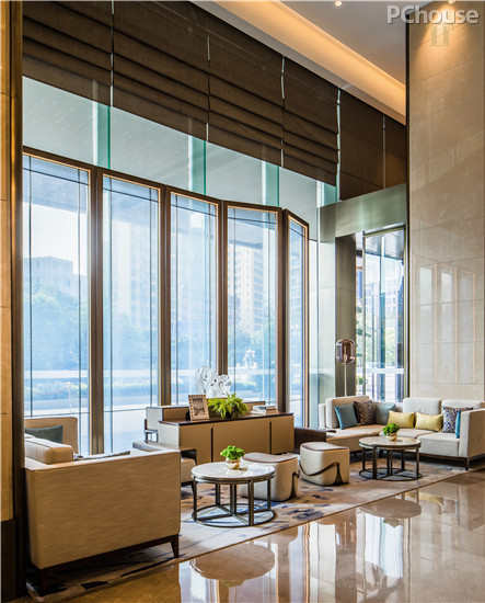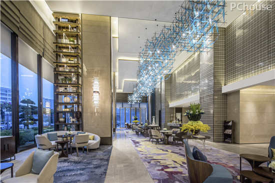 编辑点评:大堂吧的设计手法强调休闲属性,设计师通过石材、天然木材、亚克力和玻璃肌理的混合运用,突显其丰富的细节。在舒适布艺沙发和多色抱枕的装饰下,酒店大堂拥有了在家般的归属感。