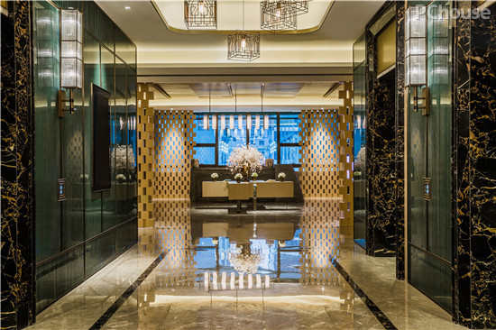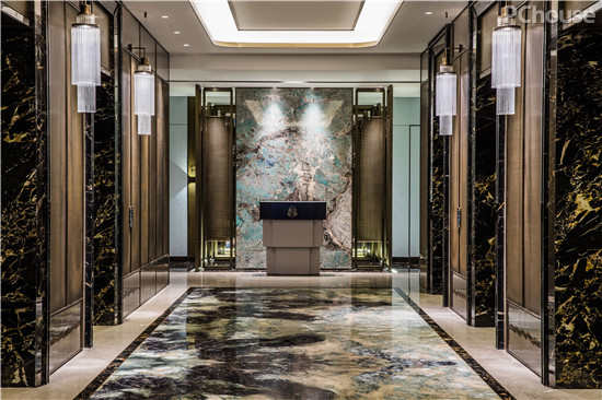 编辑点评:走廊间,大面积的大理石运用,让此处场域充满艺术设计之美,空间的清冷、质感强烈而张扬,而在长长的筒式吊灯的衬托下,又多了些许柔和。
