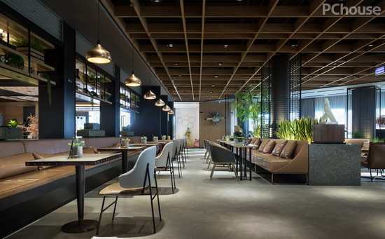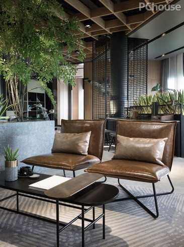 洽谈区布局自然随意,进入空间,仿佛走进了一个富有艺术味道的咖啡馆。复古中性的色调,自然质感的大理石桌,牛皮纸色的沙发,白色的方形小桌几,桌腿设计让人想见老式缝纫机,而原木单腿咖啡桌上的铆钉元素也带有一丝工业机械感,墙上装点的飞机头更是带着时光的雕刻感。