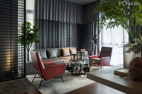 整个空间在复古格调与后现代的突奇中自由游走,协调而自然。中央的圆桌是亮点,透明玻璃桌面以类似于发动机的机械内芯作为支撑物,在工业感中彰显着前卫气息,是后现代的解构重组。复古沙发那一抹砖红让空间显得更为亮眼,黑色落地灯也是由古求新的创意装点。