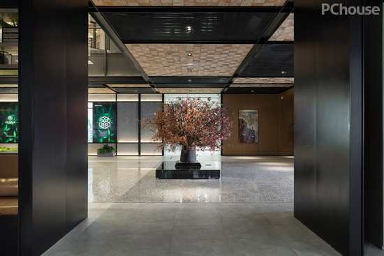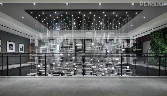 二层观景区,整面的绿植墙,给人回归当下的悠然感。另一侧墙体上悬挂着黑白旧物照片,仿佛一个时间走廊。而中间顺势而下的未来感吊灯,营造出超现实的魅力,恍兮惚兮,是另外一番曼妙景致。