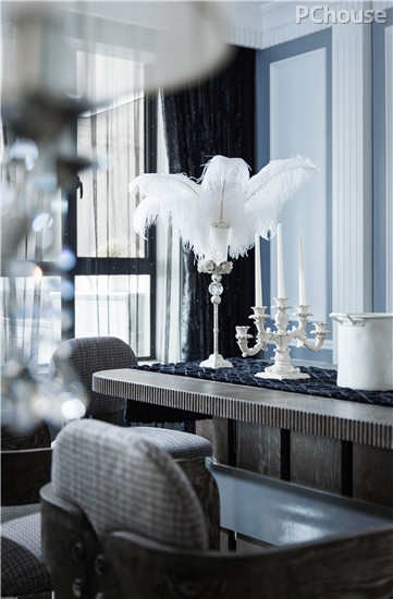 餐厅不失为整个空间的亮点,搭配极富幻想的羽毛装饰,打造出高雅轻灵的气质氛围。蓝与白的搭配,带来极为舒适的视觉变化,互相融合交织共奏。轻嗅满屋芬芳,隔着屏幕也能感受空气中曼妙的甜香与曼妙。
