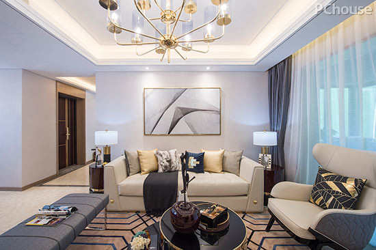 做工精致的真皮沙发、烫金抱枕,金属铜片的应用,几何抽象渐变挂画,晶莹璀璨的水晶吊灯与现代艺术对话融合,局部采用金色点缀于线脚和转折面,透过肌理的疏密以及线条的渐变,张弛有度。极强的艺术表现,把细节和元素发挥到极致,使人们仿若置身于一场穿越时空的旅行。