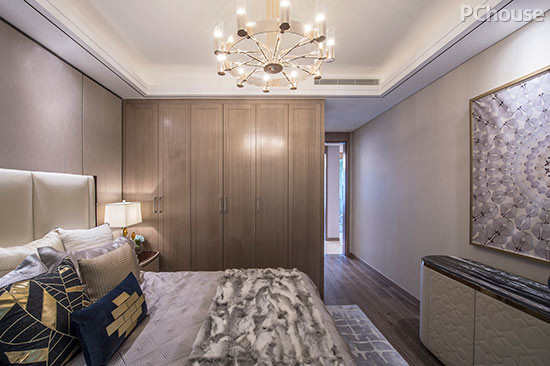 设计师对父母房的设计总体基调相对朴素和收敛,少了些浓妆艳抹,多了份清静淡雅。温润的赭石色让卧房充满温度,细腻多变的地毯线条纹路打破了空间围合的方正刻板,看似杂乱的金属线条纵横交错却蕴含空间秩序,“石”元素的点缀应用,丰富了空间,温暖了岁月,柔和了时光。