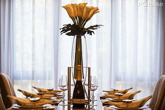 简洁明晰的布置、与得体考究的餐具相结合,在视觉上取得了精美的平衡中心,水晶藤蔓灯体与银杏元素的相互搭配,极具艺术张力,赋予空间诗意情怀,形成生趣盎然的点睛之笔。空间中散发着特有的优雅与大气,也昭示着主人随意而讲究的品质生活。