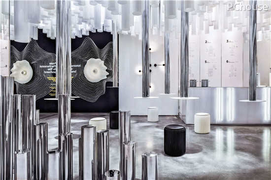 信息碎片化的当下,人容易迷失在快速变化之中。DPD希望通过视觉语言物化世间变幻的种种,鼓励来客在这个空间中,通过观察、触摸、感受造物者情绪的波动,体味变化中的规律,重拾生活的质感。而TMB混茶旗舰店的设计通过倒置的方式,在天花安置无数错落有致的管阵,解放地面空间,使整个空间变得通透,令人的视觉得以延伸,人的行为得以自由伸展,最终营造一片高低起伏,时髦而独特的「律动之林」。