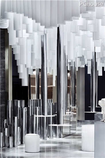 将抽象的艺术表达,转化为可感知的空间语言,并为商业经营增加效益,是本项目设计思考的核心。设计师通过倒置的方式,在天花安置无数错落有致的管阵,解放地面空间,使整个空间变得通透,令人的视觉得以延伸,人的行为得以自由伸展,最终营造一片高低起伏,时髦而独特的「律动之林」。