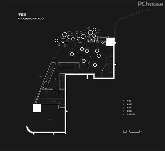 天花管阵的设计,不仅是简单的艺术表达,也是对原有空间局限性的消解。项目处于商场转角位置,可用面积十分有限。设计师把店铺的功能区分为外摆区、餐饮区、吧台区、艺术区以及商品展示区,而这些功能分区都被有机地包裹在管阵之中。
