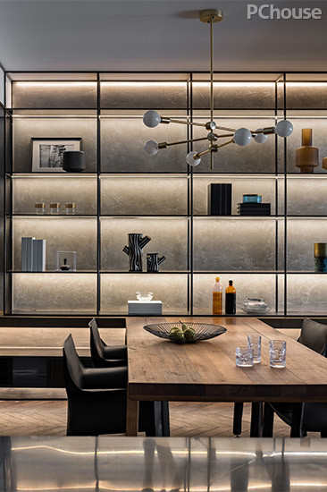 过道动线纵横有序,一条走廊将公共客餐厅与私密空间连接在一起。衣帽间、主卧、主卫、储物间合并组成一个独享套间。遍布于餐厅、客厅、书房与衣帽间对面的格架,相映成趣,又方便陆导随手取阅书籍或置物。“根据陆导特定的生活方式量身设计,因势运用每一寸空间,拿捏每一处细节,让一切都显得刚刚好。”设计师方磊补充道。
