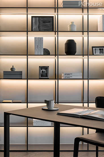 陆导工作之余喜欢阅读,所以不仅仅是在书房,我也在客餐厅、以及部分非承重墙区域设置金属格架,因势运用每一寸空间,方便陆导随时取阅书籍。