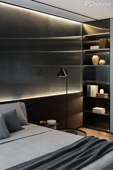 【方磊】整个空间调性简约、素雅,通过材料与灯光的变化来营造空间气质。其中一个亮点是电视背景墙引入刻花玻璃内嵌线型灯带,灯光开启后有种舞台幕布的感觉;另一大亮点是6mm金属层板定制而成的格架与纤薄灯带相辅相成,赋予空间独特光影魅力。同时这两点也是在以往案例中想做而未做的新尝试,在用材及工艺上实现了突破。