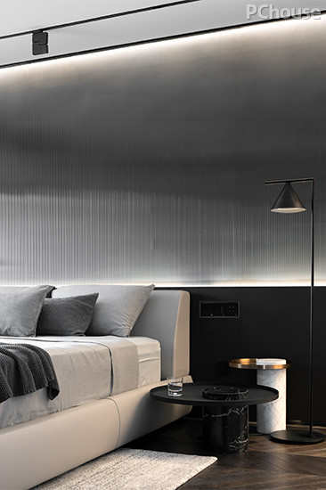 主卧位于走廊尽端,床头立面刻花玻璃和客厅电视背景墙遥相呼应,一侧灯饰家私采用设计师方磊惯用的非对称三角构成手法,演绎多种材质的碰撞、光与影的错落交叉。而窗外的绿植,也成为室内最美好的点缀。