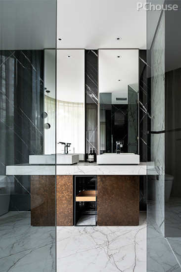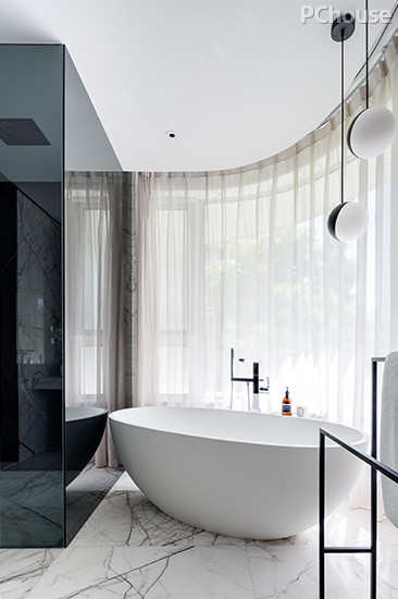 偌大的弧形拐角玻璃窗,模糊室内外界限,带来充足的采光,愈发凸显洁净清透。边沐浴边欣赏庭院的景色,压力和疲倦即刻荡然无存。