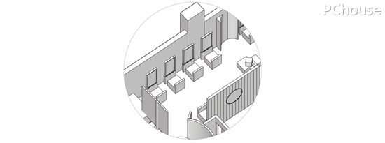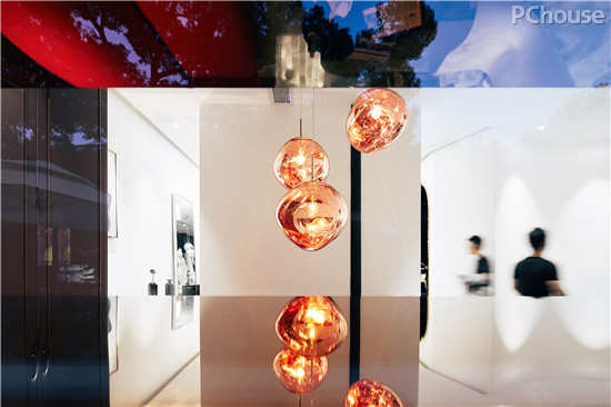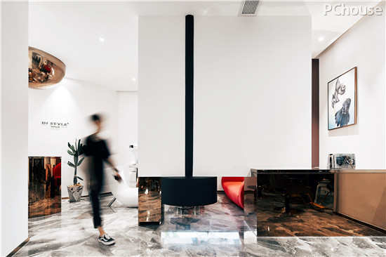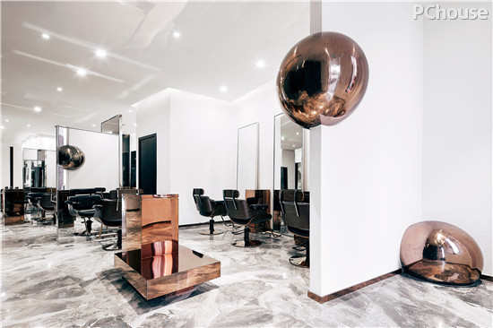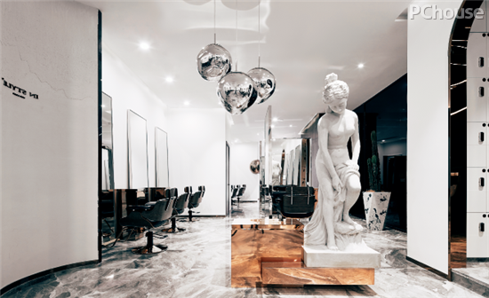 理发区是一个全开放的区域。整齐划一的座位排布,形成规整的序列,搭建起理发师展现精湛手艺的舞台。伫立在在舞台中央的艺术雕像和悬挂在天花下的球体灯饰,则在打破这种均质关系,为整个空间注入灵动的艺术气息。灯光照明上,设计师采用了尽量克制的方式,以理发区中央的管形艺术吊灯来提亮空间,使顾客能够沉浸在柔和的氛围之中。