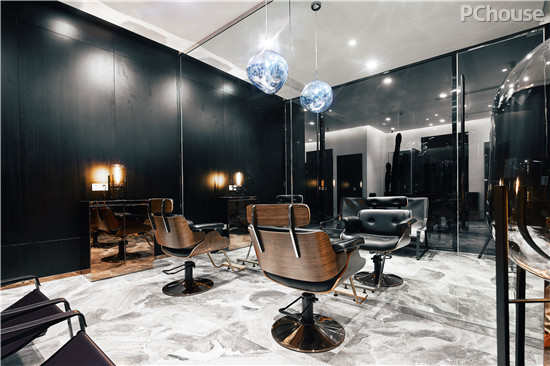 区别于开放的理发区,VIP 区的设立为高端客户提供私密场所,以提升服务质感。设计师通过材质来实现公共与私密的场景切换:镜面和黑色板材作为墙体,搭配玻璃吊灯及金属装饰,整个空间彰显沉稳的高级感。