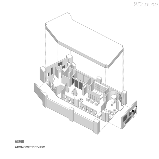 立面以几何方块组合的姿态,重新呈现于街区之中。与原来敞开式的门面做法不同,改造后下方的洞口成为窥视内部场景的唯一取景框,内部的精彩变得收敛而神秘,视野则聚焦在人的活动范围;上方的洞口以反光玻璃遮盖,与街景相映成趣。入口设置在右侧,为丰富内部功能场域提供了充足的空间,亦是蜕变之旅的起点。化大为小的设计手段,使得空间立面在光影变幻之间,产生微妙的表情变化,激荡起充满趣味的城市想象。
