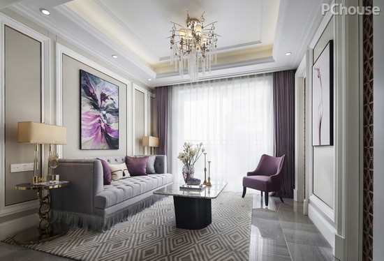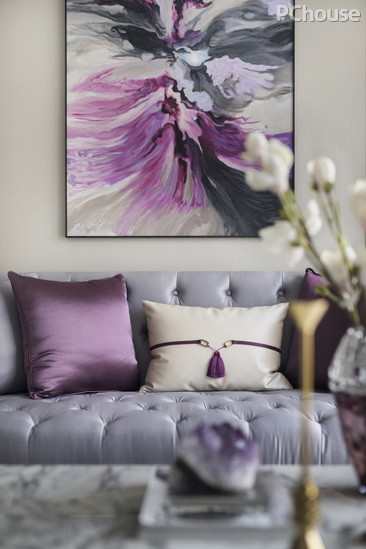 空间在低调优雅的灰白基底包围之下,紫色温婉装点,弥漫一室浪漫情韵。气质典雅的欧式护墙板置入空间,分隔客餐厅的界限。沙发上的流苏点缀,就像乐谱上巧妙安排的装饰音,令空间的旋律舒缓而灵动。壁上相对的挂画,一幅是色彩的恣意相融,宣扬自我;一幅似倾洒而出的酒香,妩媚迷人又轻雅愉悦,自然而然地渗透到每个角落。