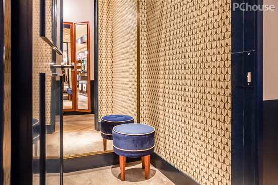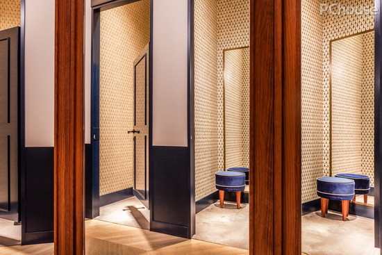 为配合当前的潮流特点,中央位置是风格时尚的酒吧型柜台。设计师特别订制的1920年代风格圆形地毯摆放在店的中间。原创设计的黄铜灯饰点缀在店铺的中央,渗出工业风格的气息。权威与现代在门面直接碰撞. 背光的金色标志衬托着先进的LED屏幕。