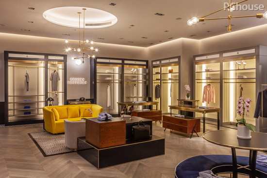 Brooks Brothers 品牌的经典品味再一次与香港IFC旗舰店的原创风格完美融合,当中包括折曲的隔间和搁架,令产品仿似飘浮着一般,更显吸引。无处不在的金色标志以时尚的黄铜构造,并巧妙隐藏在两个部分:深蓝色与木制展柜为男装区的标志,而白色背光设计则为女士专属区。