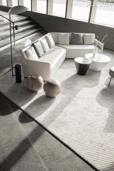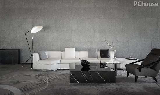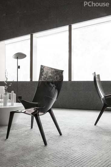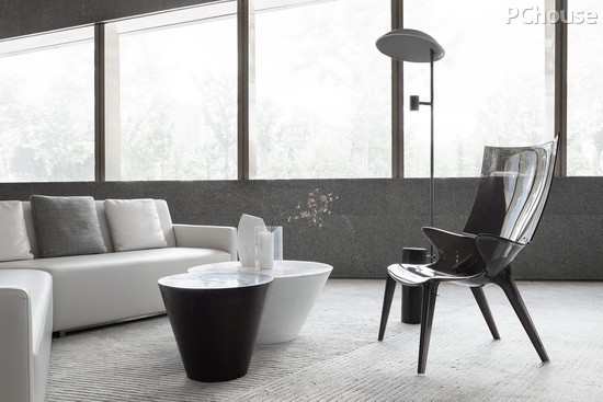 家具造型呼应建筑体量的几何线条感,纯白简灰的极简色调,与通透的理石面、黑色的静穆搭配,呈现一种坚硬与柔软并存、光洁与粗重并呈的特殊质感。纤柔的花艺同样以极少的艺术寂静地存在,编织出空灵朴拙的安静感与美。