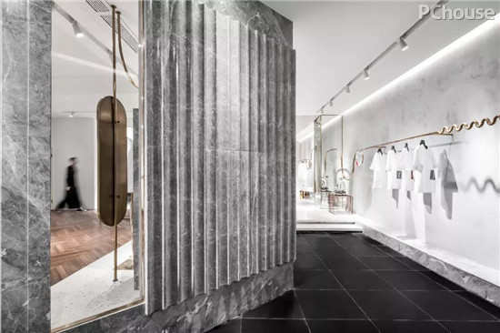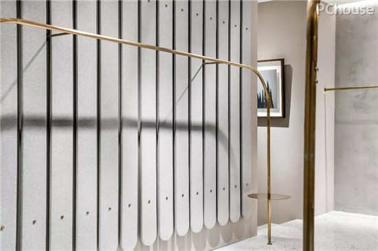 石材的线条、褶皱象征布料的肌理,黄铜色衣杆穿针引线般贯穿整个空间。