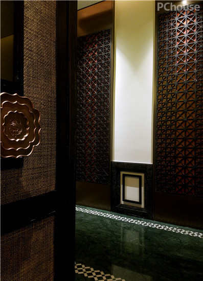 主要用材:大花绿大理石、白色大理石、古铜色和纹不锈钢、橡木饰面、草编壁纸