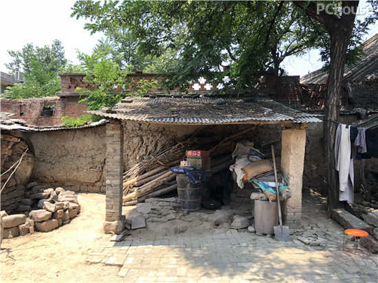 张老爷子所居住的是一个典型的北方农家小院,房屋是传统的土坯坡屋顶样式,主屋坐北朝南。按照传统,南侧集中搭建着饲养耕牛的牛棚,以及堆放草料和肥料的临时建筑。门口是半露天的土棚厨房,进门后只有简单的家具,儿子的床靠窗,采光非常弱,老人的床也相当的简易。抬起头看屋顶,漏得已见天光,室内的夯土地面非常潮湿。