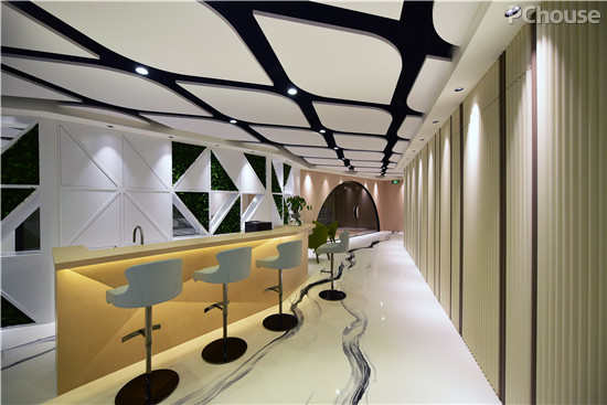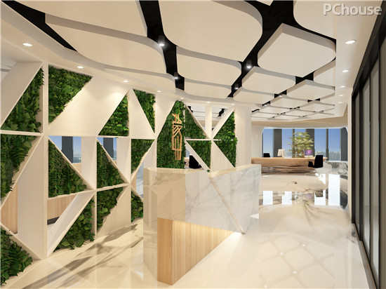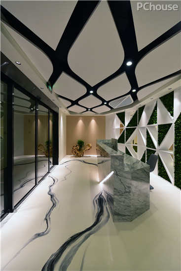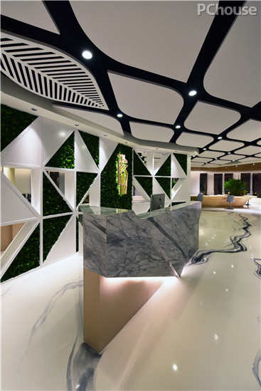 在设计的细节处理上,设计师将入口前台区域的背景墙以储物柜和绿植做结合,一方面满足储物的功能性,同时让前台区域置身于自然生态环境中,将背景墙在局部进行了镂空设计,使来访者透过储物柜可以隐约的看到其它空间,前台区域的空间由此得到延展变得通透。
