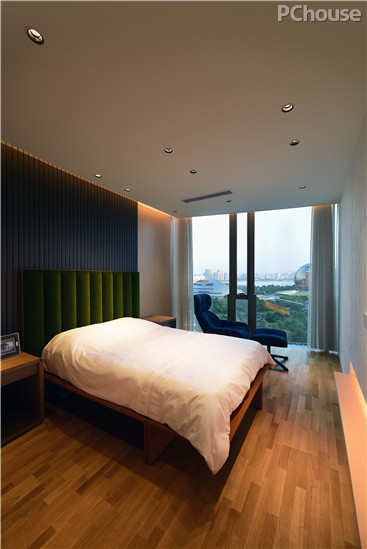总经理办公室的背景墙后方,设计师设计了一个安静、舒适的休息室隐藏于背景墙收纳柜之后,美丽的江景伴随多功能的休息场所,作为业主疲乏、困顿时的休息空间。