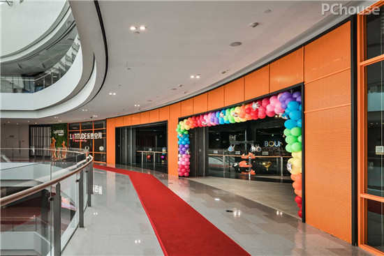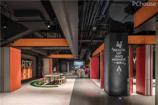 门口区域的设计同样以山陵形状延伸,以俐落线条呈现山陵,并增加澳洲元素体现品牌形象,使用与party room相同的橙色冲孔板作为主要材质,融入品牌色与轻工业元素,整体打造更鲜明的品牌形象,重塑品牌价值。