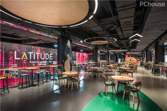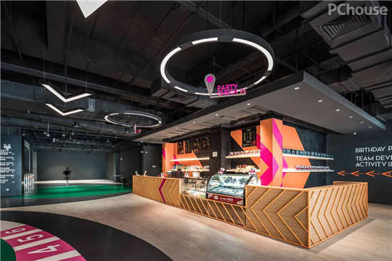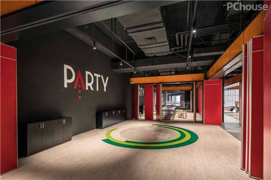 5F则以餐饮与PARTY为主轴,延续公园的概念,利用地面色彩与跑道作为元素的延伸,不同大小的PARTY ROOM以丰富明艷的色彩点燃客户的视觉飨宴,并透过各种活动移门满足各种功能。