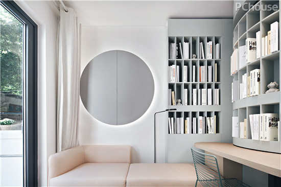 墙面上特设的调光玻璃读书角,既带来了额外的采光,也便于家人在客厅时与孩子交流,了解孩子的活动情况。