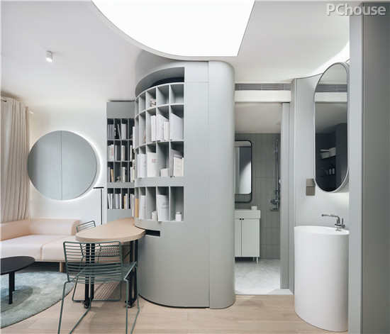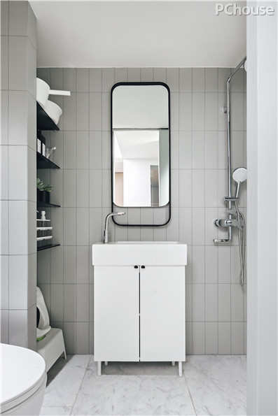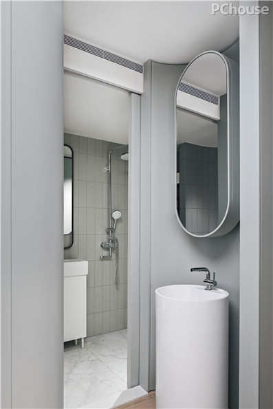 圆弧型造型相比直线体块,更好地节约了空间。外悬的洗手池,便于全家人随时使用。内部则巧妙利用空间分割实现了干湿分离,有效地在较小的空间内实现了实用功能。专安装的小型洗手池,方便照顾孩子时随手用水。