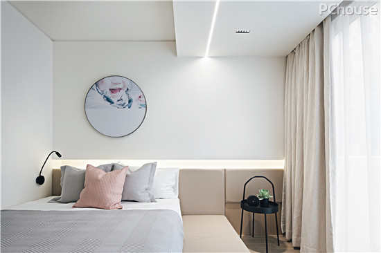 主卧室体利用通道处和阳台区不同大小的区域,分别打造了较薄和正常体量的储物柜,较薄的柜体通过合理分区,可以用于储纳小物品和临时挂衣;厚柜体则通过高度的合理安排,帮助夫妻俩轻松收纳。