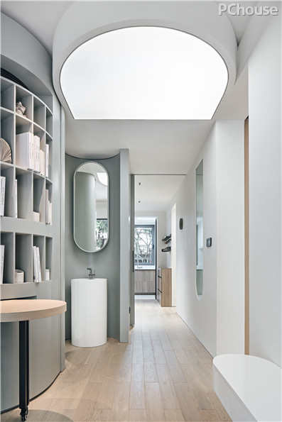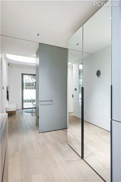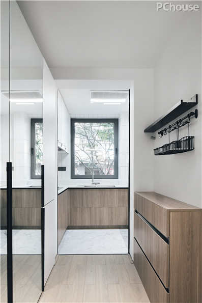进处保留作为玄关,特制的双层镜隔离了室外的噪音,既拥有双层巨大的储纳空间,又在视觉上形成充分的延展性,让空间显得十分通透。