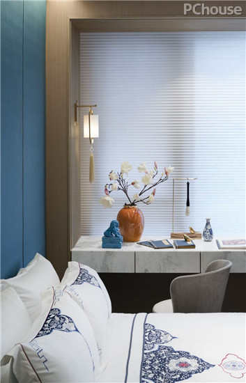 有别于一般淡雅素净的卧室基调,森博团队运用抢眼的橘红彩绘主卧床铺,挹注如曙光初升般的明亮色彩;并搭佐宝蓝色寝具,突显高贵典雅质感,让原本平淡沈稳的休憩空间,充满活力生机。而仔细一看会发现,设计师悄悄将中国传统元素带入其中;以传统屋檐造型刻画床头线条,更添尊贵雅韵;同时挂置古典窗花意象的流苏吊灯,揭开传统融合现在的「新东方时尚」面纱。