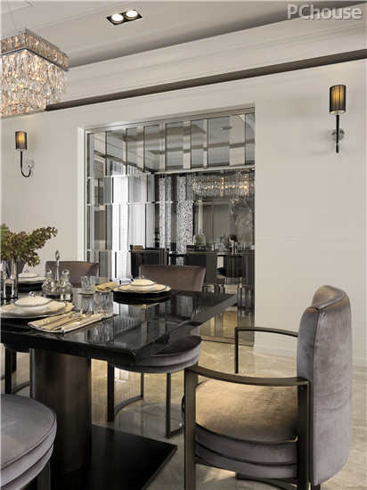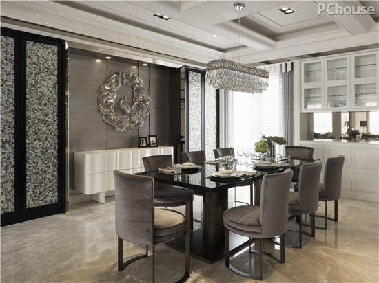 餐厅作为凝聚情感的重要轴心,延续客厅书房沈静优雅调性,另缀以金属、石材、玻璃等不同材质交织其中;设计师将塬先的入口配置大面门片,亮银色的不锈钢与水晶吊灯巧妙唿应,也为用餐时光增添典丽质感;餐桌正前方挂置工艺精品,彰显屋主品味同时享受一场美学的盛宴。