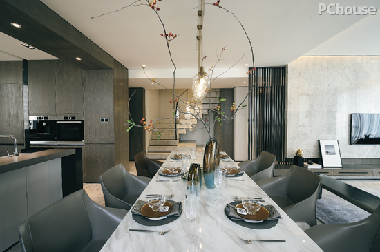 “延续”性的设计脉络,还体现在楼梯与餐厅的吊灯,相得益彰的出现,使餐厅成为横向与纵向两条空间动线的中心,更加精致完整。西餐吧台在明畅的中庭内形成餐厅与厨房视野交叠的可能,令人与人之间不经意的发生互动。