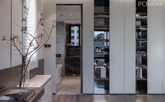 就好像主卧,为了延展“居其室”的可能,张健带入了空间功能跨界的设计理念—即酒店商业型空间与居家空间的混搭。衣柜为整面漆板的柜门,结合开敞的层板架,带来虚实对比反差,从外观和实际功能赋予居住者全新的感受,仿佛置身于高端酒店,但也不失家的温暖。