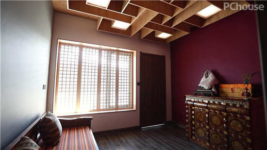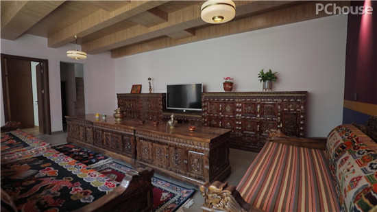 客厅是洛桑家最大的一个空间,逢年过节都会有许多亲戚朋友来这里聚会,晚上也会睡在这个房间。藏式的吊顶和藏式的柜子都有着浓厚的民族风情,然而在平日里,这里几乎没有什么作用,利用率非常低。